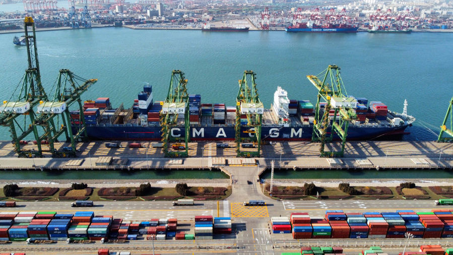 1月11日,一艘貨輪??吭谔旖蚋厶窖髧?guó)際集裝箱碼頭(無(wú)人機(jī)照片)。新華社記者趙子碩 攝