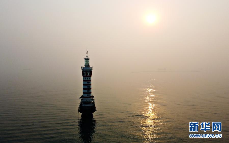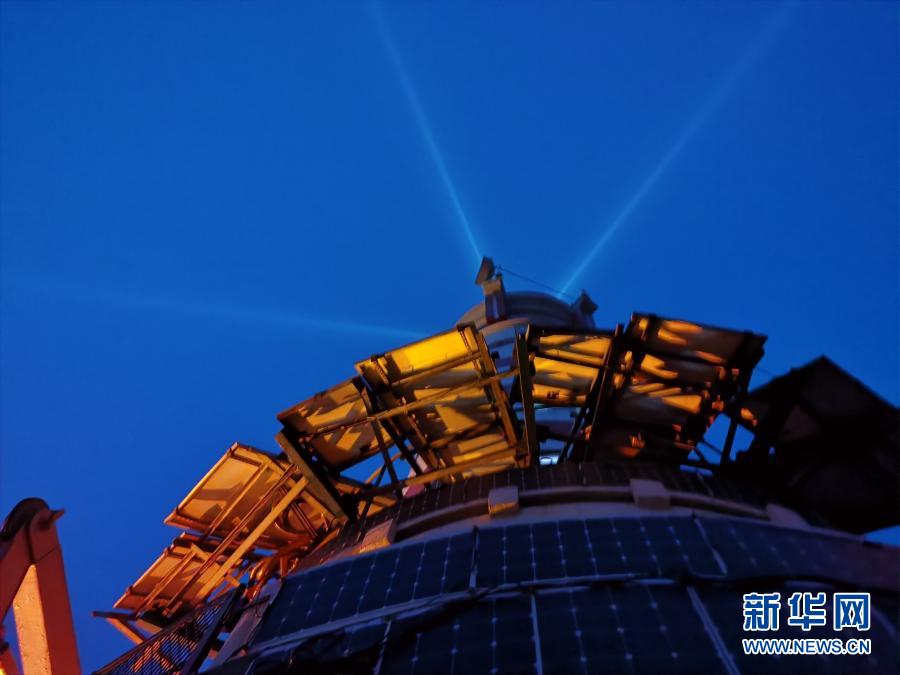 夜幕降臨,天津港附近海域風(fēng)平浪靜,海天一色。隨著最后一抹夕陽消失在海平面下,一束明亮的光柱從大沽燈塔的燈籠中射出,倏然穿透了暮靄的靜謐。