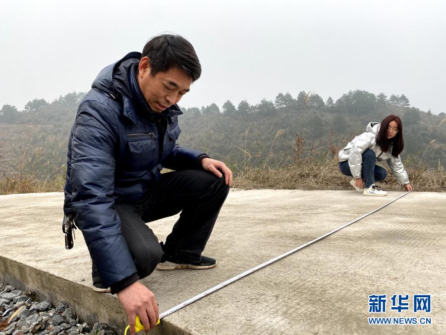 1月27日,駐麻溪口村幫扶工作隊隊長段吉廣(左)在村內(nèi)進行新建道路的測量。新華社記者 柳王敏 攝