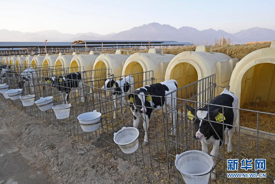 在寧夏農(nóng)墾賀蘭山奶業(yè)有限公司牛犢飼養(yǎng)區(qū),小牛犢準(zhǔn)備進(jìn)食(2020年11月8日攝)。新華社記者 王鵬 攝