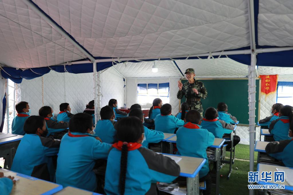 5月24日,武警青海總隊果洛支隊機動大隊排長張國睿為花石峽鎮(zhèn)藏文中心寄宿制小學(xué)的孩子上課。新華社記者 劉新 攝