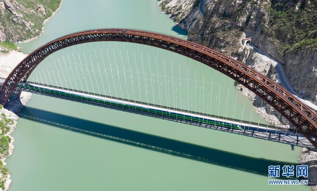 試運(yùn)行的復(fù)興號(hào)列車行駛在藏木特大橋上(6月17日攝,無(wú)人機(jī)照片)。