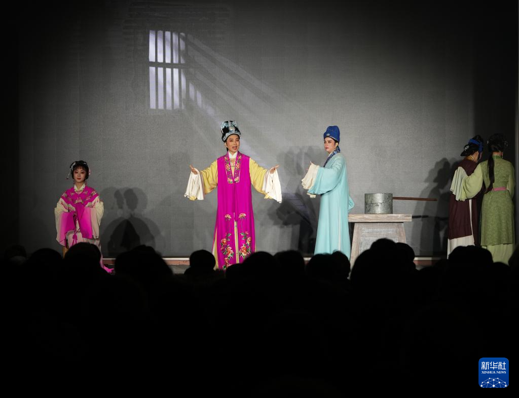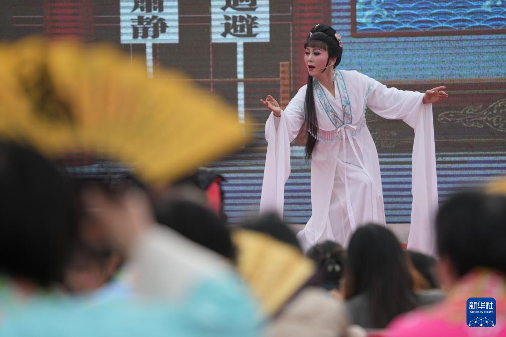 在绍兴市越城区,演员在“绍兴古城过大年”活动上表演越剧《何文秀》选段(1月29日摄)。