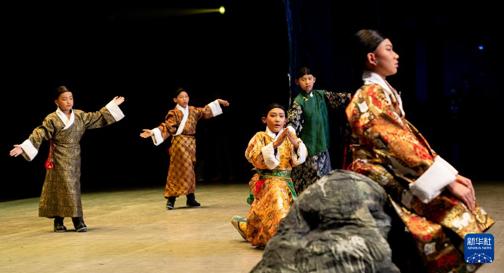 这是西藏首部少儿舞台剧藏戏《顿月顿珠》演出现场,罗桑朗觉(右三)在剧中饰演“顿月”(2月11日摄)。