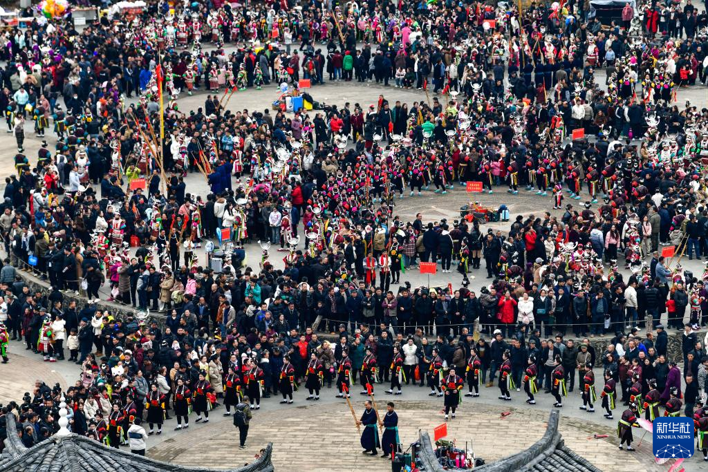 这是2月16日拍摄的贵州省凯里市舟溪镇“甘囊香”芦笙节活动现场(无人机照片)。