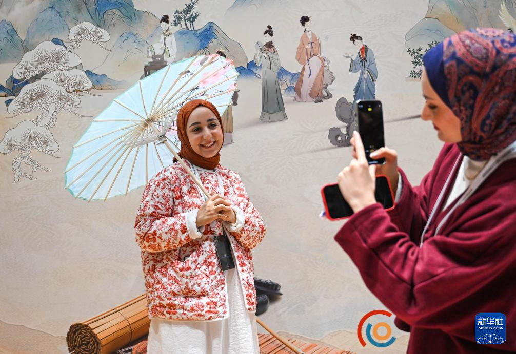 2月25日,两名土耳其观众在第十届伊斯坦布尔出版联谊会中国文化展区拍照留影。