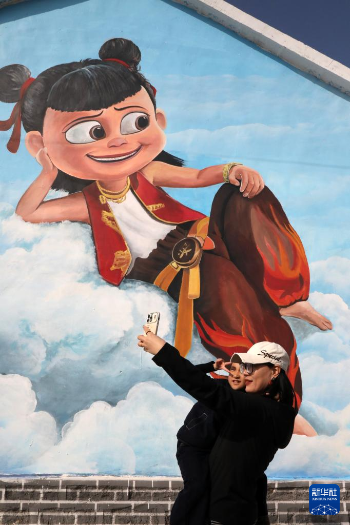 3月1日,人们在山东省滨州市博兴县乔庄镇东冯村的哪吒主题墙绘前拍照。
