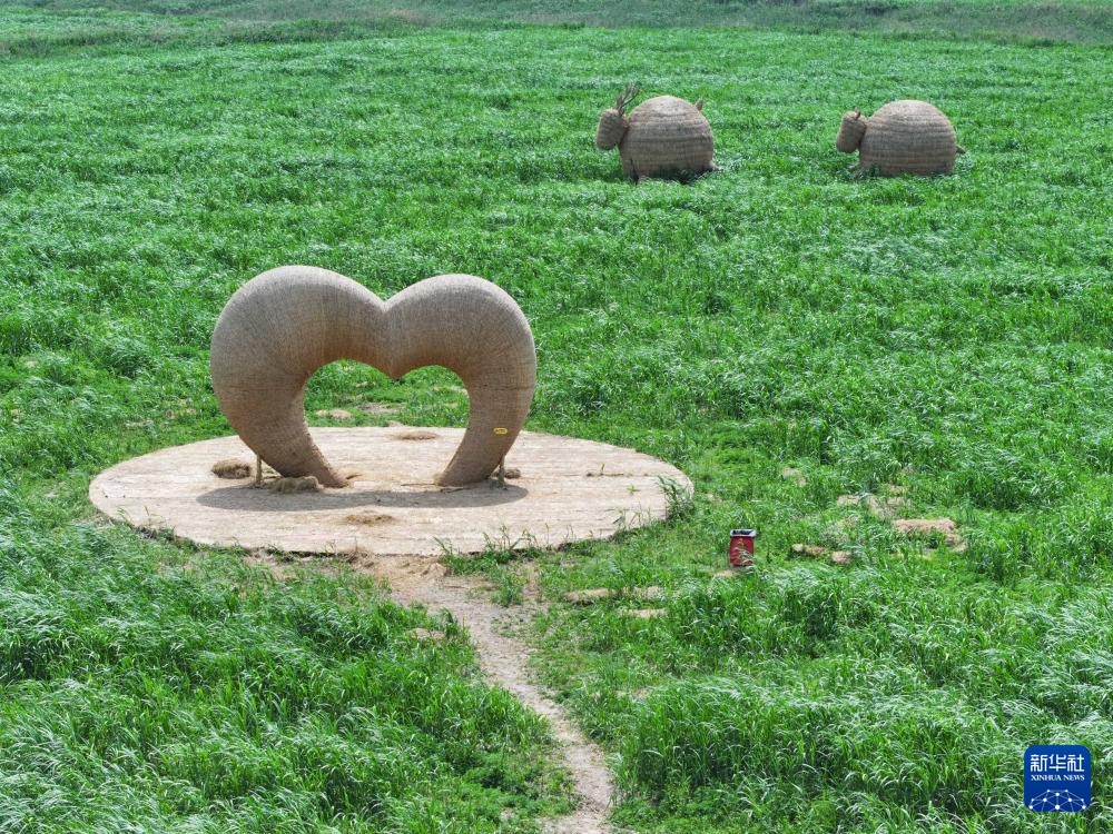 4月17日,在湖南省岳阳市君山区微笑绿洲生态营地,游客在芦苇艺术季活动现场游玩(无人机照片)。