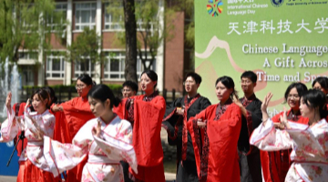3月29日,在山东省临沂市王羲之故居,身着传统服装的女子参加迎接“三月三”的活动。