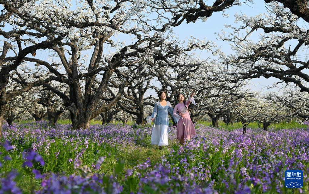 4月4日,游客在安徽省宿州市砀山县玄庙镇梨园赏花踏春。