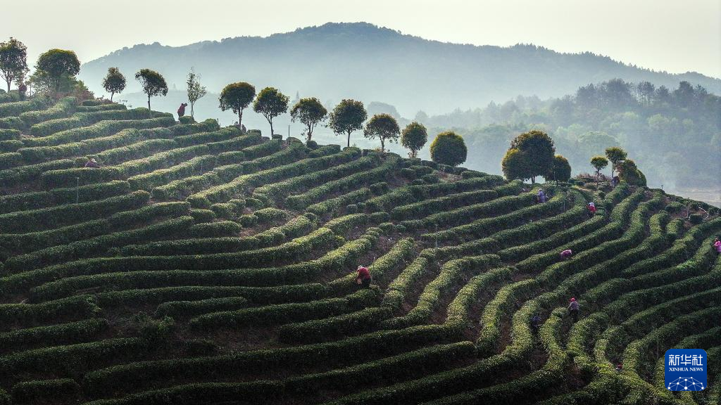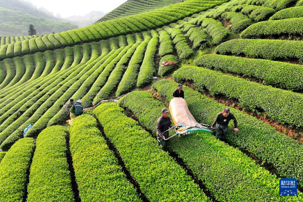 4月1日,茶农在江西省宜春市靖安县仁首镇生态茶园内采摘春茶(无人机照片)。