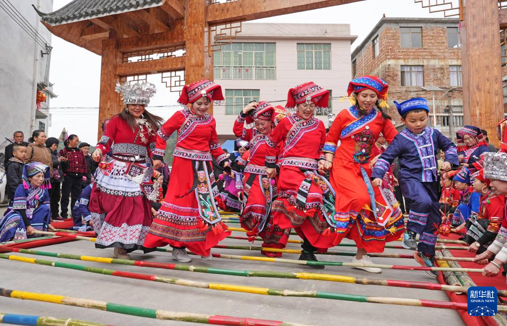 3月31日,人们在广西柳州市融水苗族自治县三防镇的“三月三”活动上跳竹竿。