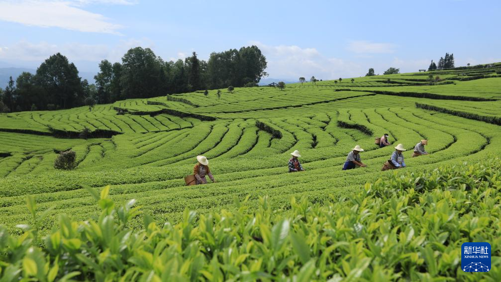 4月17日,在云南省腾冲市团田乡大坪山茶园,茶农在采摘雨前茶。