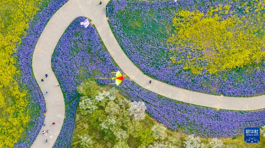 4月4日,市民在江苏邳州银杏湖风景区踏青游览(无人机照片)。