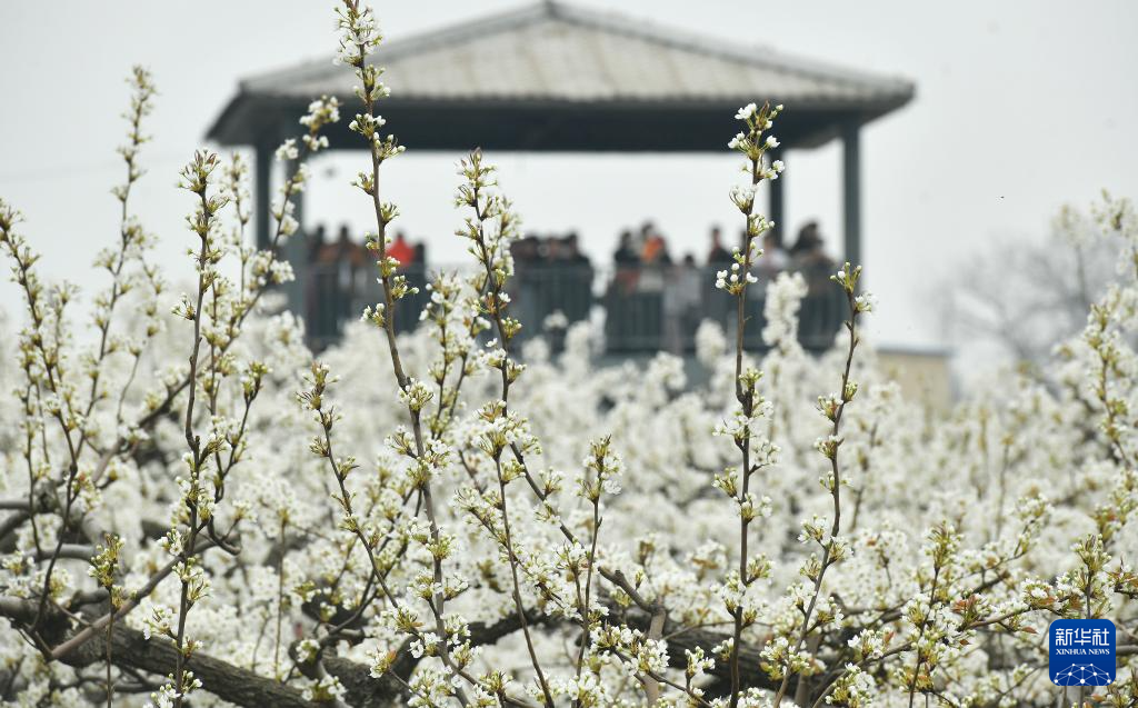 4月4日,游客在河北省沧州市肃宁县万里镇尹家庄村观景台欣赏梨花。