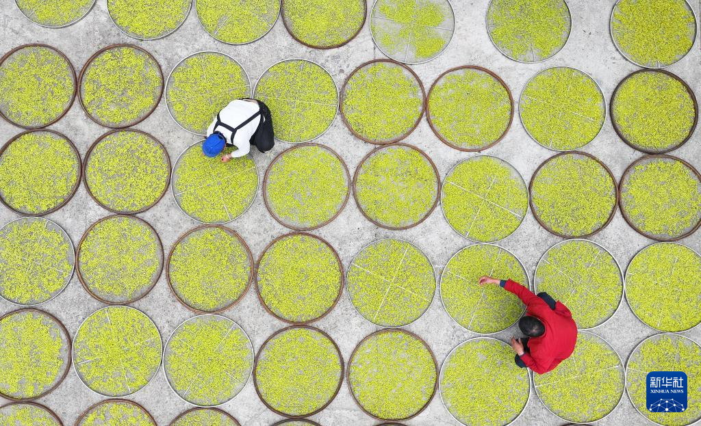 4月7日,在湖南省永州市双牌县上梧江瑶族乡盘家村云台山生态有机茶园,茶农在摊晒春茶(无人机照片)。
