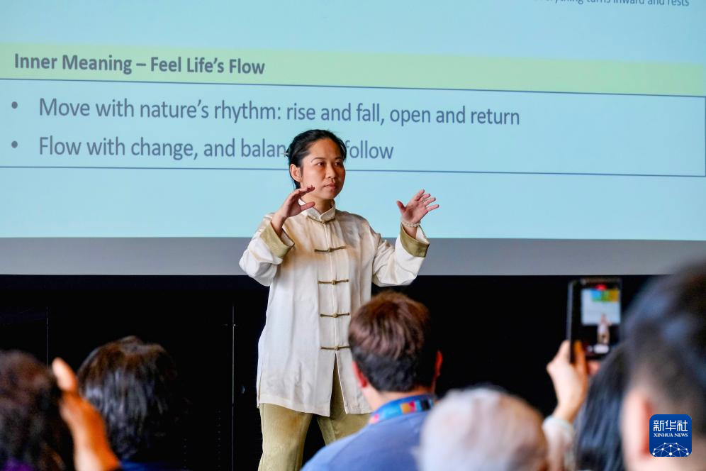 4月27日,在新西兰克赖斯特彻奇,上海中医药大学专家演示八段锦。