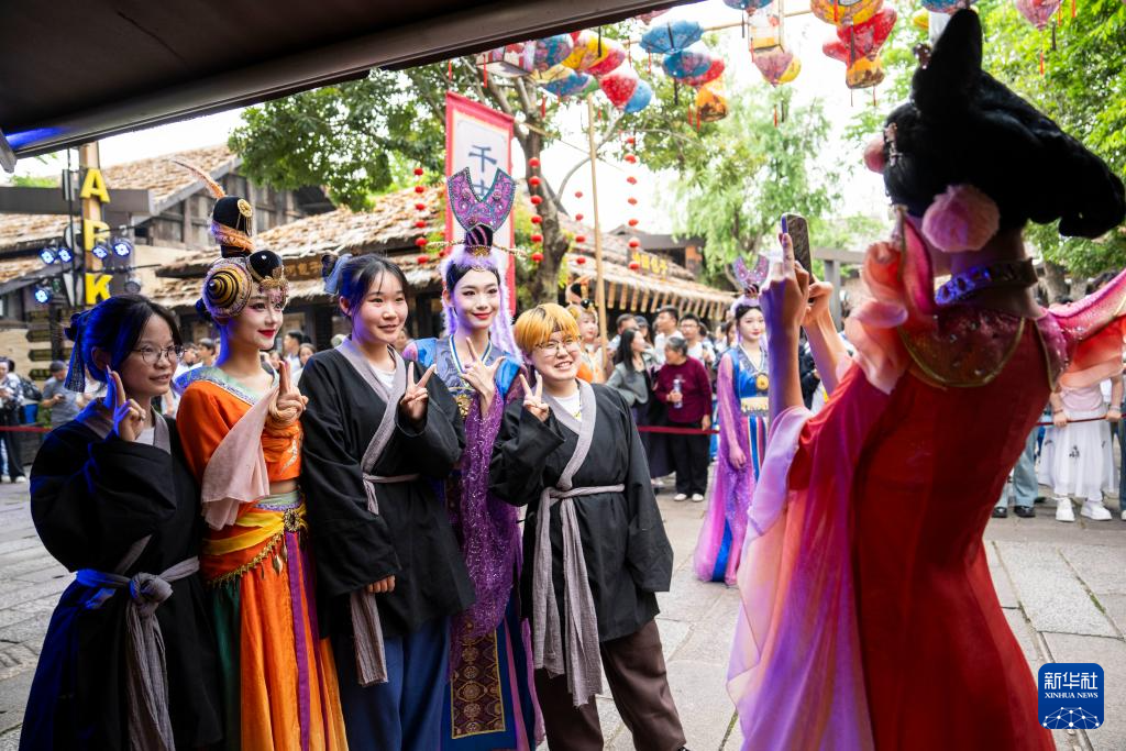 4月28日,在宁乡市炭河古城景区,学生与景区演员合影。