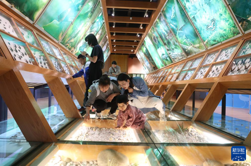 5月18日,家长带着孩子在江苏常州博物馆参观熊猫时代科普特展。