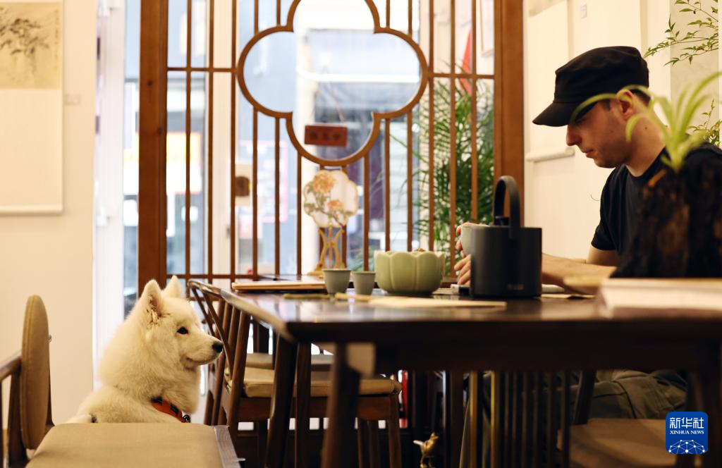 顾客带着宠物狗来到法国巴黎的隐庐茶室喝茶(2024年7月3日摄)。