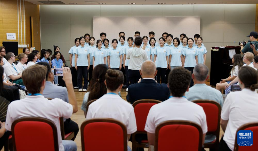 7月14日,在中国交响乐团,河北省正定中学合唱团团员与犹他谷大学合唱团团员交流。