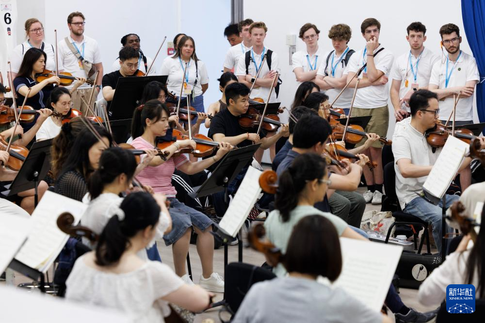 7月14日,在中国交响乐团,犹他谷大学合唱团、河北省正定中学合唱团等团员在观看乐团排练。