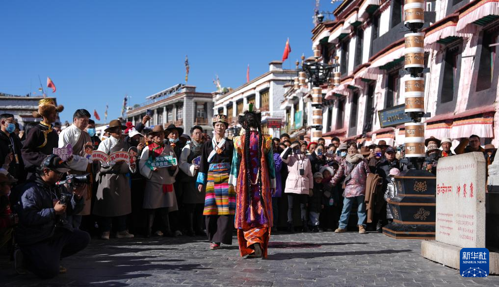模特在拉萨八廓街“繁饰自然·衣彩拉萨——拉萨新年服饰秀”活动中巡游(1月3日摄)。
