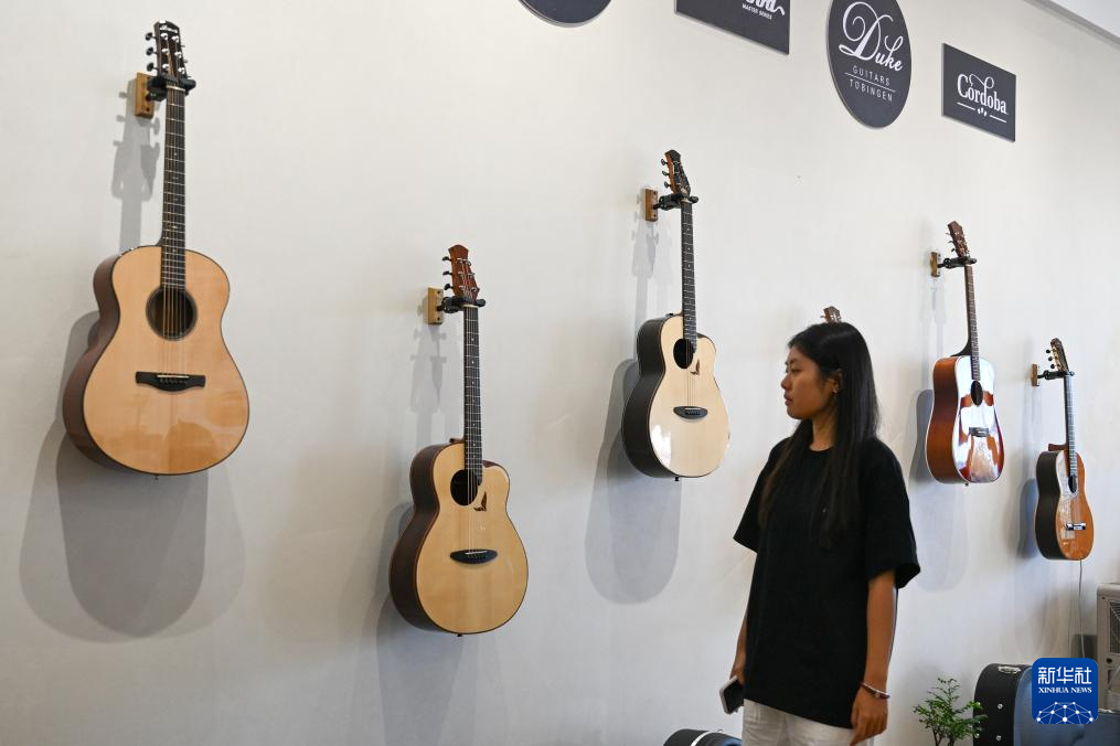 8月28日,参观者在湖北省松滋市一家吉他企业展厅参观吉他成品。