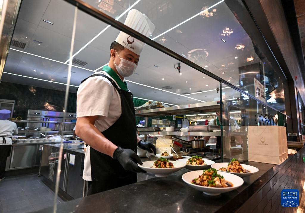 9月24日,宁夏吴忠市一家早茶店厨师将做好的小吃递到窗口。