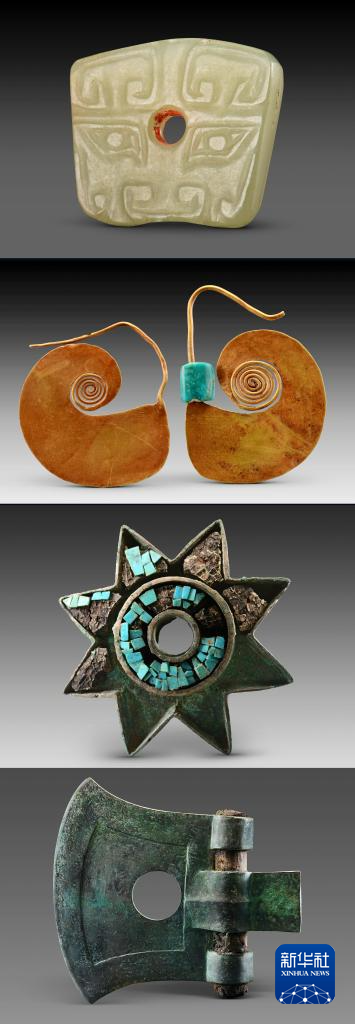 拼版照片:陕西清涧后刘家塔墓地出土的玉兽面饰、金耳环、镶绿松石铜饰以及瓦窑沟墓地出土的铜钺(由上至下,资料照片)。