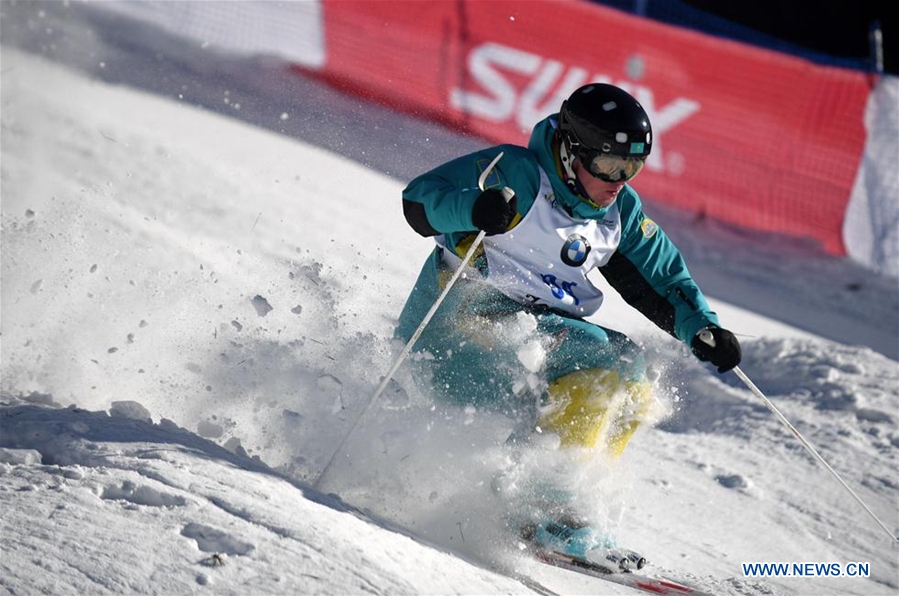 Dmitriy Reikherd of Kazakhstan competes during the men's Moguls on the Day 2 of the 2017-2018 Freestyle Skiing World Cup-Moguls & Aerials at the Thaiwoo ski resort in Chongli District of Zhangjiakou City, north China's Hebei Province, Dec. 22, 2017. Dmitriy Reikherd won the second place of the event with 84.92 points. (Xinhua/Wang Xiao)
