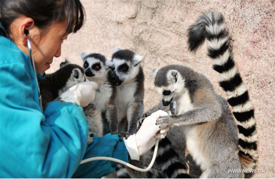 A veterinarian examines ring-tailed lemurs at the Qingdao Forest Wildlife World in Qingdao City, east China's Shandong Province, Nov. 21, 2017. (Xinhua/Yu Fangping)