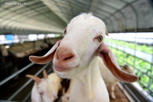 A goat is seen in a company in Jianshe village of Haian County, east China's Jiangsu Province, Aug. 18, 2017. (Xinhua/Gu Huaxia)