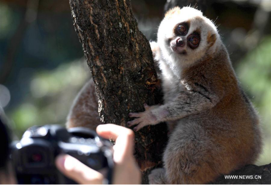 A visitor takes photos of a loris at the Yunnan Zoo in Kunming, capital of southwest China's Yunnan Province, Nov. 17, 2017. (Xinhua/Lin Yiguang)