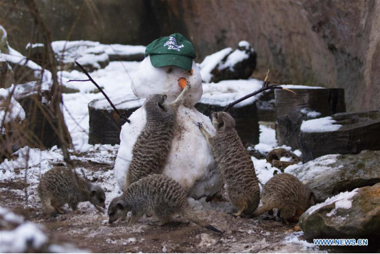 Meerkats play with a snowman in the snow at ZSL (Zoological Society of London) London Zoo in London, Britain on Dec. 10, 2017. (Xinhua/ZSL London Zoo)