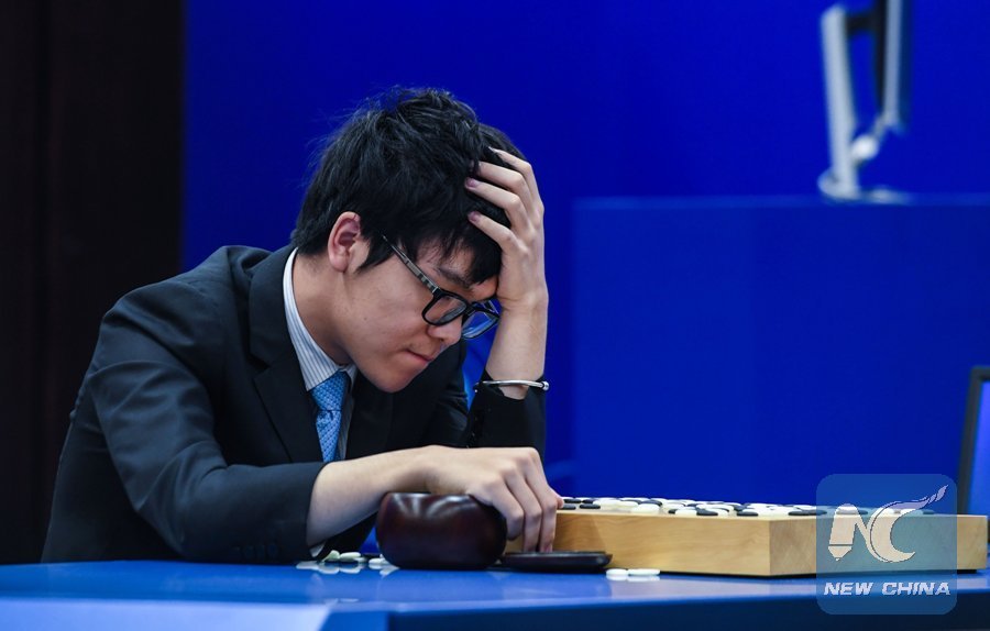 Chinese Go player Ke Jie analyses the game after the second match against artificial intelligence program AlphaGo in Wuzhen, east China's Zhejiang province, May 25, 2017.(Xinhua/Xu Yu)