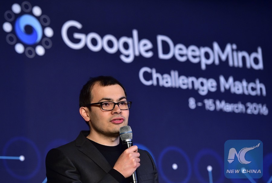 This file photo taken on March 15, 2016 shows Google Deepmind head Demis Hassabis speaking during a post-match press conference after the fifth and final game of the Google DeepMind Challenge Match between South Korean 'Go' player Lee Se-Dol and Google-developed supercomputer AlphaGo at a hotel in Seoul. (Xinhua/AFP)