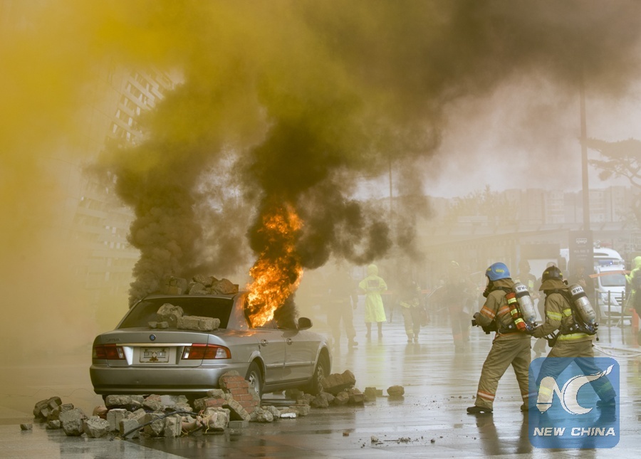 File Photo: South Korean firefighters participate in a civil defense drill in Seoul, capital of South Korea, Aug. 23, 2017. The defense drill associates with the South Korea-U.S. Ulchi Freedom Guardian joint military exercise. (Xinhua/Lee Sang-ho)
