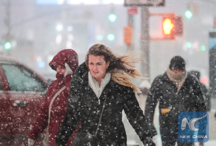 People walk in a snow storm in New York, the United States, Jan. 4, 2018. New York State Governor Andrew Cuomo has declared state of emergency for the entire downstate region on Thursday as a snow storm continued to pound the U.S. East Coast. (Xinhua/Wang Ying)
