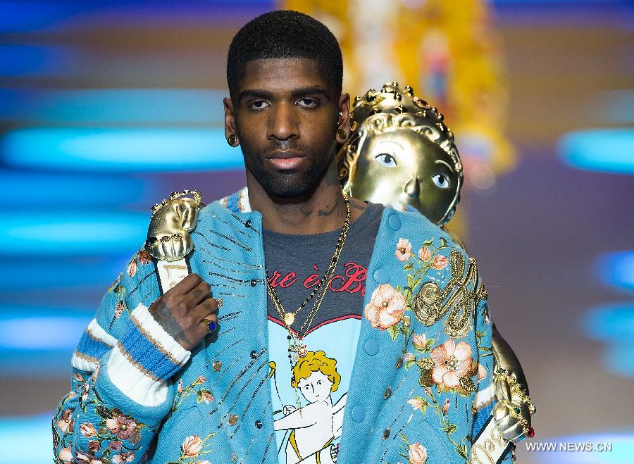 A model presents creations for fashion house Dolce&Gabbana during Milan Men's Fashion Week Fall/Winter 2018/19 in Milan, Italy, Jan. 13, 2018.(Xinhua/Jin Yu)