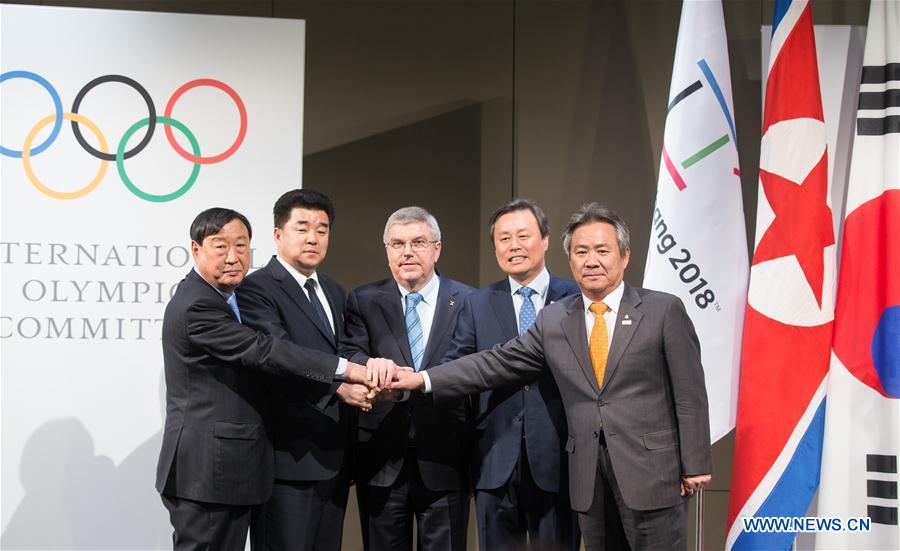 Lee Hee-beom, president of the PyeongChang Organizing Committee for the 2018 Olympic and Paralympic Winter Games (POCOG), the Democratic People's Republic of Korea (DPRK)'s Olympic Committee President and Sports Minister Kim Il Guk, International Olympic Committee (IOC) President Thomas Bach, South Korea's Sports Minister Do Jong-hwan and South Korea's President of the National Olympic Committee (NOC) Lee Kee-heung (From L to R) shake hands during a ceremony after a four-party meeting at the IOC headquarters in Lausanne, Switzerland, Jan. 20, 2018. (Xinhua/Xu Jinquan)