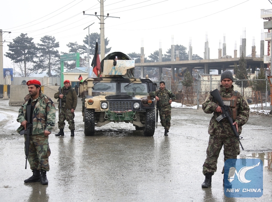 Afghan army soldiers stand outside Marshal Fahim National Defense University after attack in Kabul, Afghanistan, Jan. 29, 2018. (Xinhua/Rahmat Alizadah)