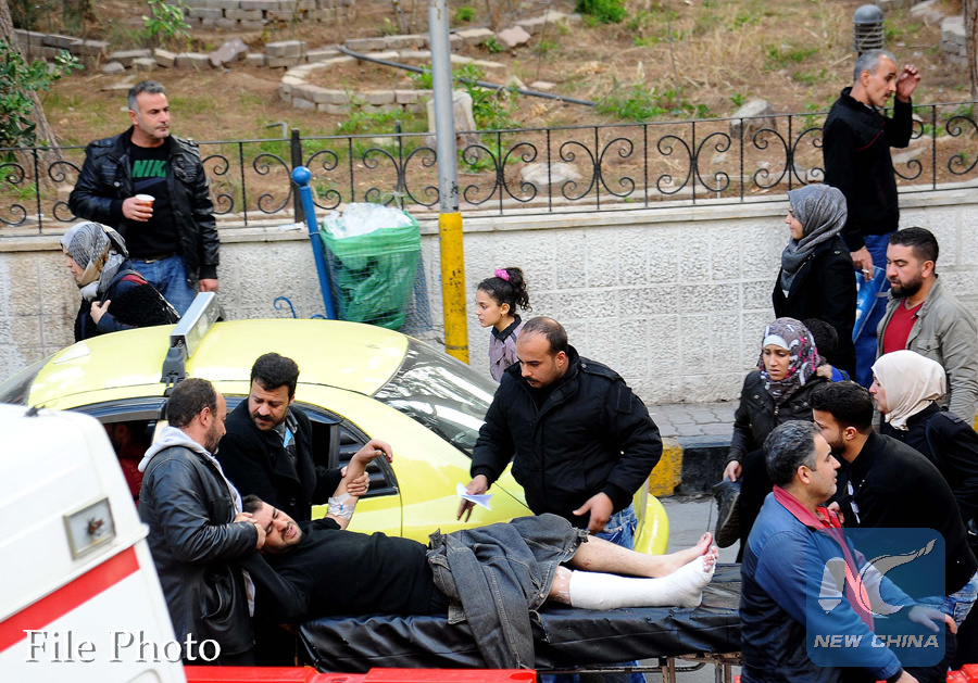 People get a wounded man into ambulance in Damascus, capital of Syria, on Feb.20, 2018. (Xinhua/Ammar Safarjalani)