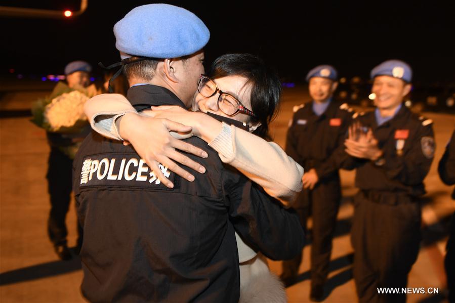 Chinese peacekeeper Han Zhuoqi (L) hugs his wife upon his arrival at the Hangzhou Xiaoshan International Airport in Hangzhou, capital of east China's Zhejiang Province, Feb. 27, 2018, after conducting a one-year mission in South Sudan. The sixth team of Chinese peacekeeping police to South Sudan, with seven members all selected from Zhejiang, arrived in Hangzhou Tuesday evening. In South Sudan, the police officers fulfilled a variety of tasks in the capital Juba and Wau, including patrols of refugee camps, humanitarian aid and community-based police services. (Xinhua/Huang Zongzhi)