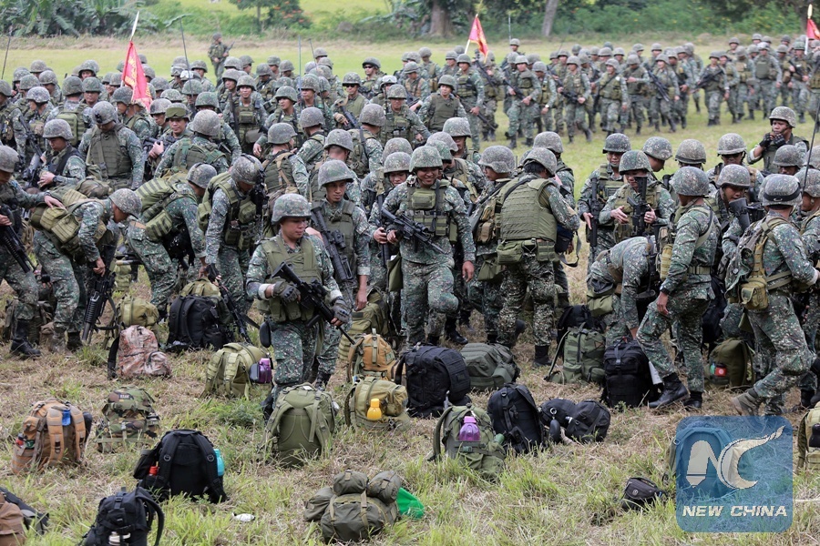 Soldiers from the Philippine Marine Battalion Landing Team (MBLT) and Marine Special Operation Group (MARSOG) gather their belongings after their send-off ceremony from their combat duty against pro-Islamic State (IS) militants in Marawi City, the Philippines, Oct. 21, 2017. (Xinhua/Rouelle Umali)