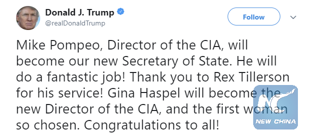 WASHINGTON, March 13 (Xinhua) -- Amid mounting uncertainties over U.S. foreign policy, President Donald Trump on Tuesday announced to replace Secretary of State Rex Tillerson with Director of Central Intelligence Agency (CIA) Mike Pompeo.