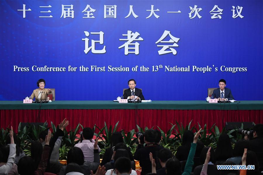 Chinese Minister of Environmental Protection Li Ganjie (C) takes questions at a press conference on the battle against pollution on the sidelines of the first session of the 13th National People's Congress (NPC) in Beijing, capital of China, March 17, 2018. (Xinhua/Shen Hong)