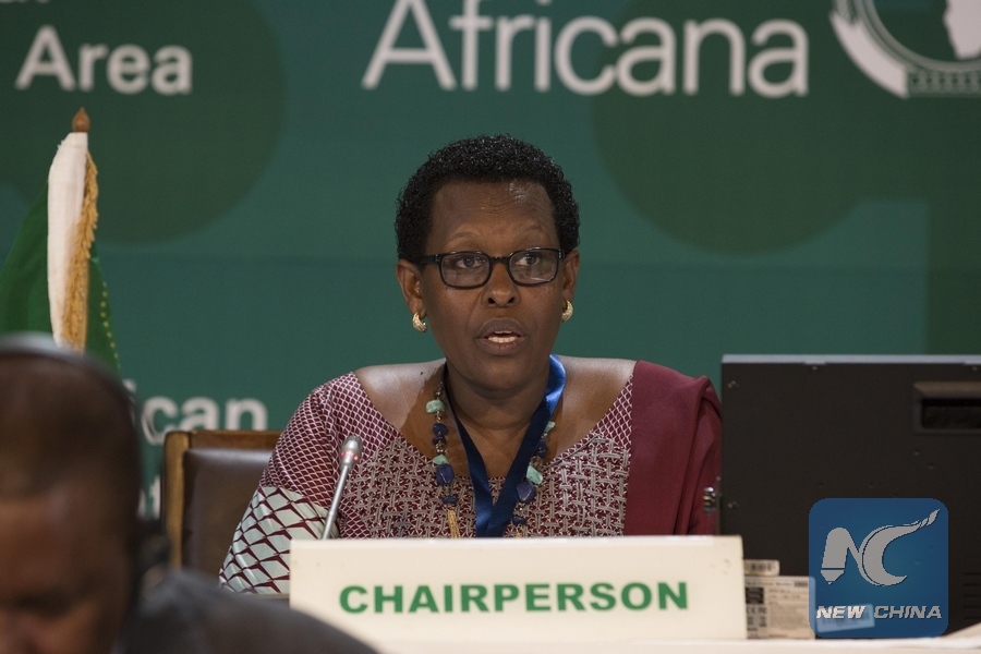 Hope Tumukunde, chairperson of the Permanent Representatives Committee (PRC) of the African Union (AU), speaks at a PRC meeting in Kigali, Rwanda, on March 17, 2018. African leaders are expected to sign an agreement that will launch the African Continental Free Trade Area (AfCFTA) at an extraordinary summit of the African Union (AU) kicked off here on Saturday. The summit started Saturday with a meeting of the Permanent Representatives Committee (PRC) of the AU, a preparatory meeting of the heads of state and government summit. (Xinhua/Gabriel Dusabe)
