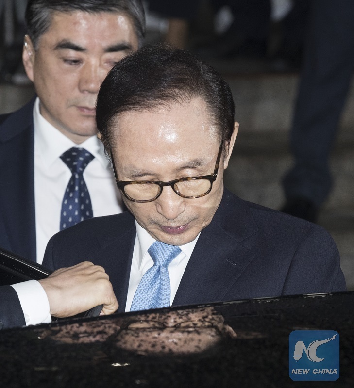 Former South Korean President Lee Myung-bak leaves the Seoul Central District Prosecutors' Office after appearing before state prosecutors for questioning over a string of corruption charges including bribery in Seoul, South Korea, March 15, 2018. (Xinhua/Lee Sang-ho)