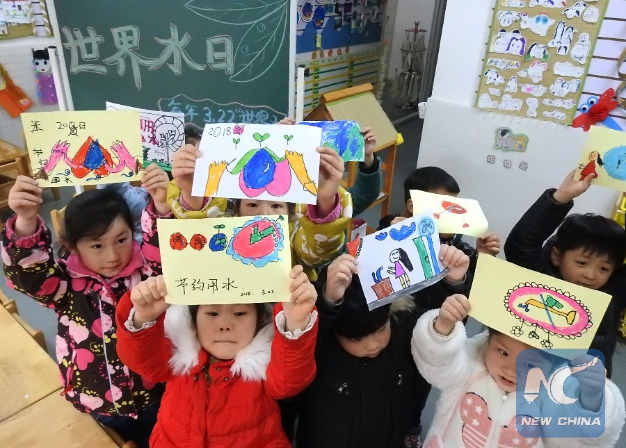 Children show their paintings themed on saving water at Haizhouwan Central Kindergarten in Lianyungang City, east China's Jiangsu Province, March 22, 2018, on the occasion of World Water Day. (Xinhua/Geng Yuhe)